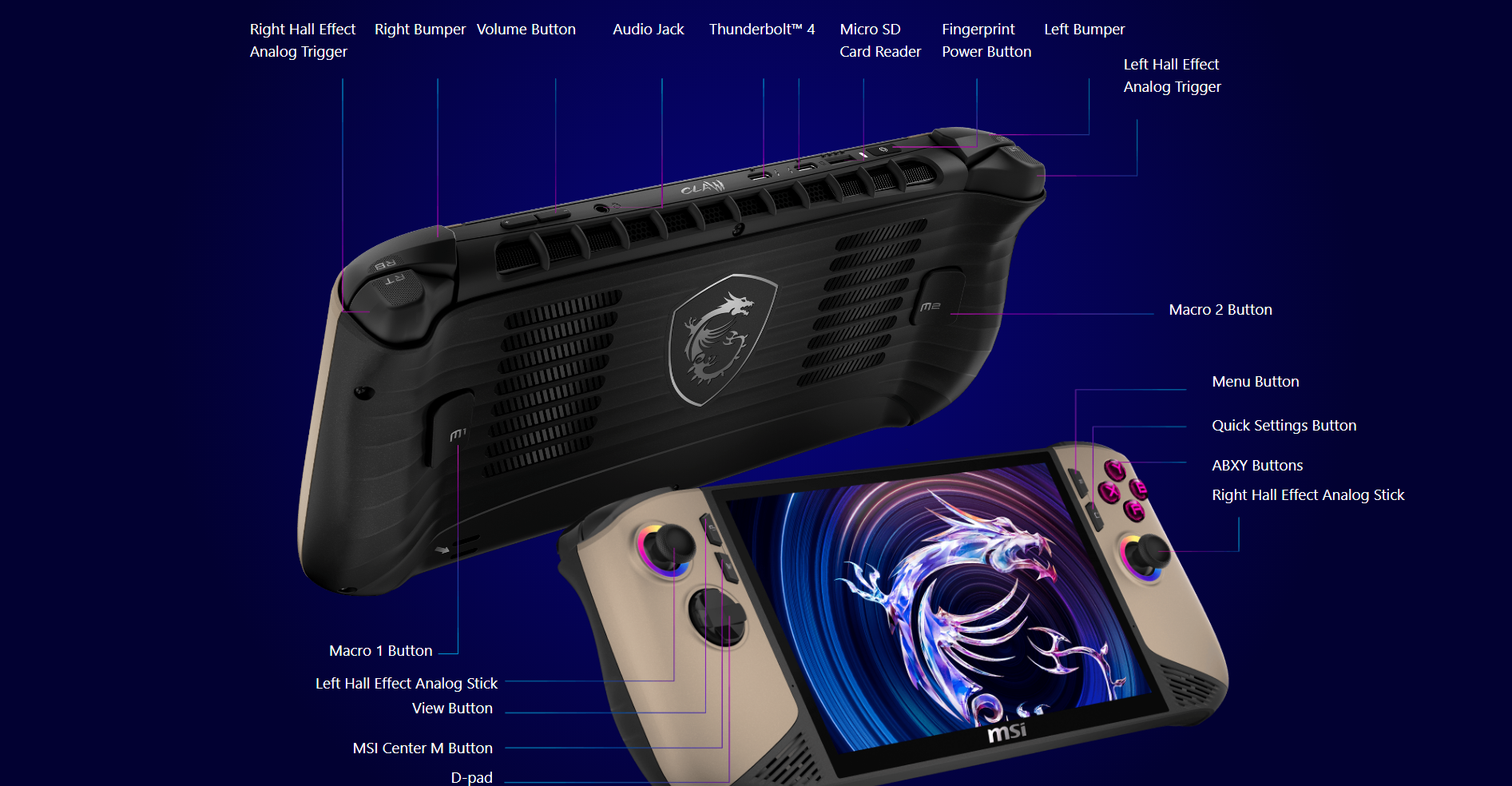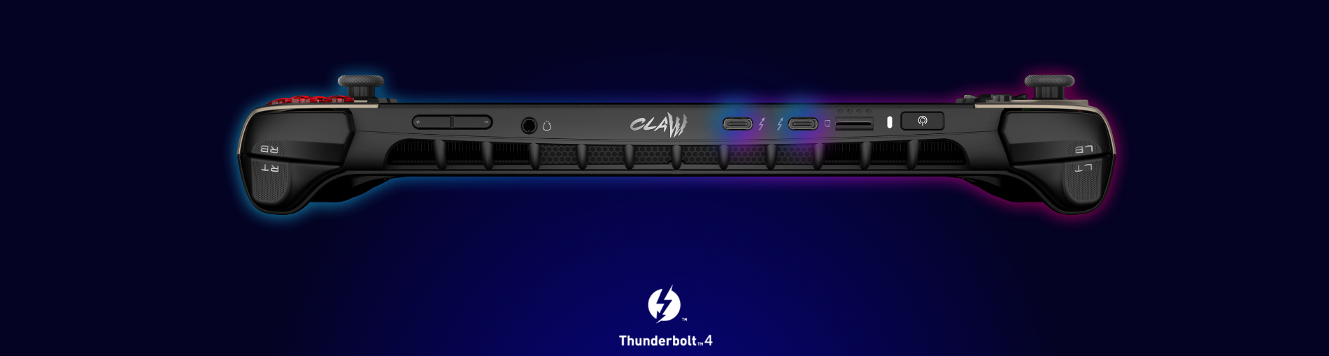 | Интерфейс | 1x Micro SD Card Reader 2x Thunderbolt™ 4 (DisplayPort™/ Power Delivery 3.0) 1x Mic-in/Headphone-out Combo Jack Кнопки управления: RGB ABXY buttons RGB L & R Hall Effect analog sticks D-pad L & R Hall Effect analog triggers L & R bumpers View button Menu button MSI Center M button Quick Settings button Macro button (M1/M2) HD haptics 6-Axis IMU |