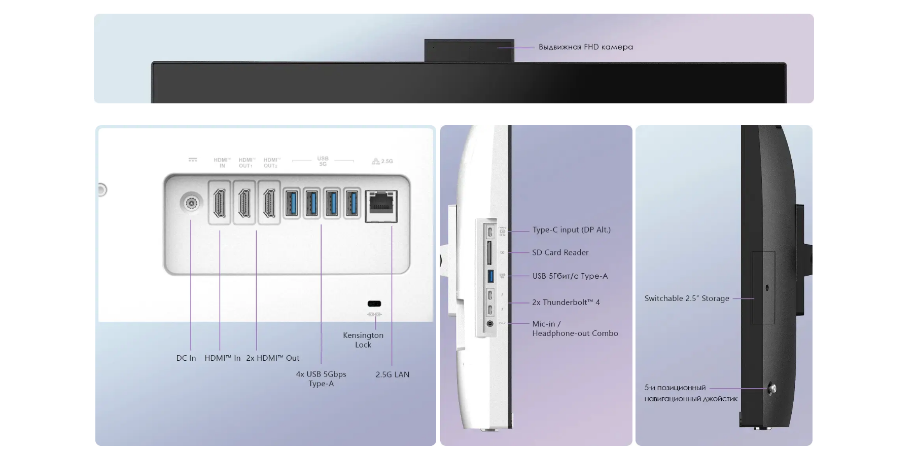 | Интерфейс | 4x USB 3.2 Gen 1 (5Гбит/с) Type A 2x Thunderbolt 4 1x HDMI in 2x (v2.0) HDMI out 1x SD Cardr eader Съёмный разъём для 2.5" SSD/HDD Kensington LOCK VESA 100 x 100 mm |