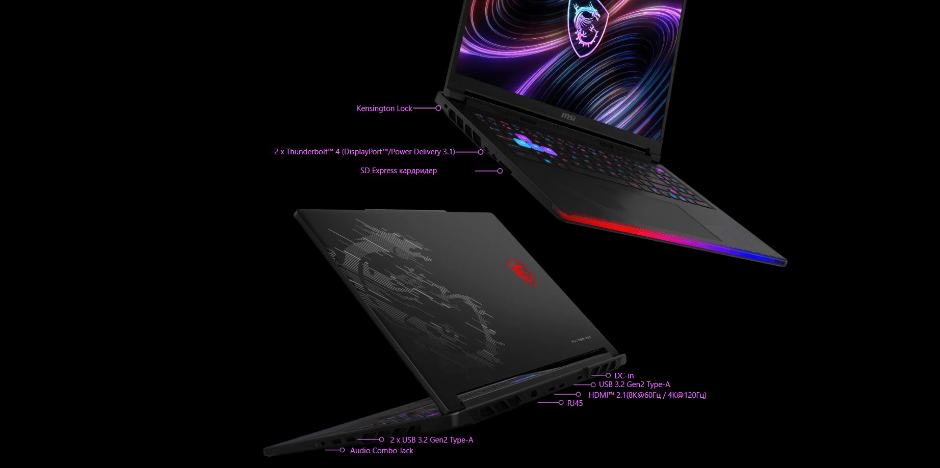 Ноутбук Raider 16 Max HX оснащен комплексным набором портов ввода-вывода, поддерживающих подключение разнообразных устройств и вывод изображения. Это обеспечивает пользователям высокую гибкость при работе с ноутбуком.